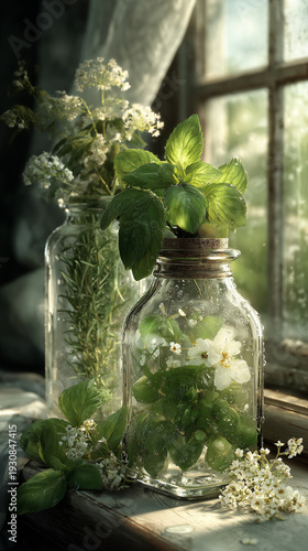 Zioła i białe kwiaty w szklanych słoikach ustawione na oknie. Ciepłe promienie słońca i delikatna mgiełka tworzą marzycielski, sielski klimat.