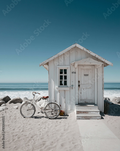 Słoneczny dzień na plaży z drewnianym domkiem i rowerem. Ścieżka prowadzi prosto do wejścia, zapraszając do wypoczynku nad błękitnym oceanem.