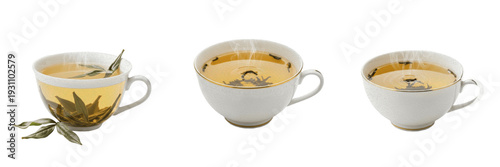 White peony tea in porcelain cup side view isolated on white background, Camellia sinensis Bai Mu Dan, delicate white tea, premium hot beverage, antioxidant tea, wellness drink, healthy tea, loose lea