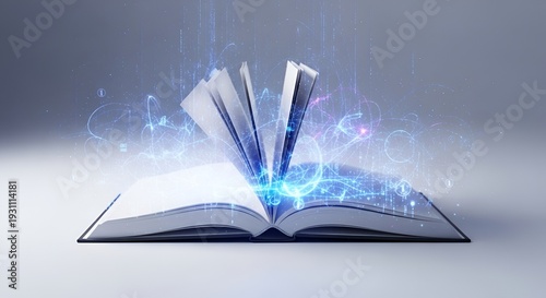 Magical book with glowing pages and swirling digital connections
