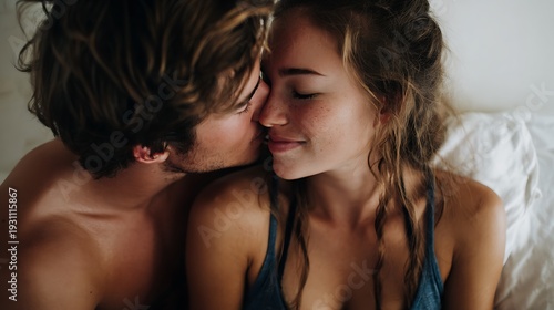 Affectionate young couple shares a tender morning moment while embracing closely in soft bedroom lighting.