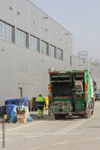 Śmieciarka odbierająca odpady przy hali magazynowej, pracownicy wywozu śmieci i pojemniki na segregację, logistyka komunalna w strefie przemysłowej.