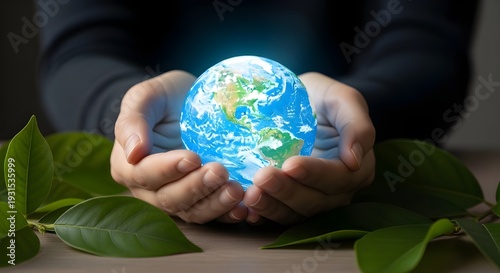 Concepto del Día Mundial de la Tierra. Energía Verde, Recursos Renovables y Sostenibles. Cuidado Ambiental y Ecología. Mano abrazando hoja verde y globo hecho a mano