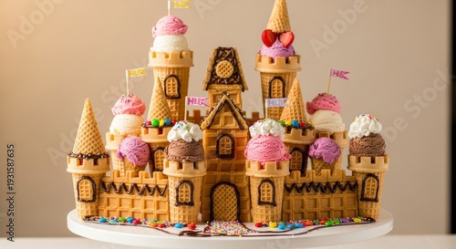 Decorative ice cream castle on a white pedestal with colorful details