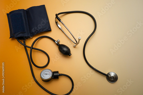 Professional mechanical sphygmomanometer and black stethoscope are placed on a warm orange gradient background. This composition is ideal for visualizing cardiological examinations,