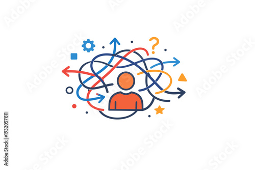 Algorithm anxiety interpreted as a tangled flow of arrows and data points around a simple human icon, representing confusion, unpredictability and lack of
