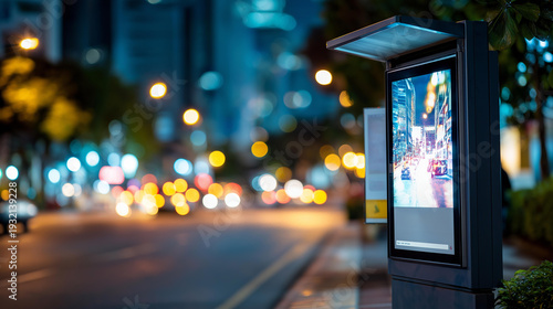 Blank vertical billboard standing on a busy city street at nighttime awaiting new advertisements, defocused urban background, nighttime outdoor advertising concept, city billboard