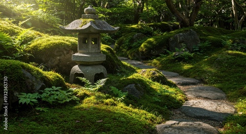 苔むした庭園の石灯籠と石畳の小道