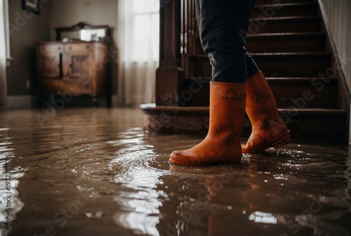 A person in orange rubber boots stands in ankle deep murky floodwater inside a home