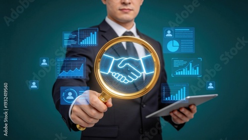Businessman holding magnifying glass with handshake icon,partnership agreement analysis and corporate due diligence concept for collaboration,merger evaluation and strategic growth