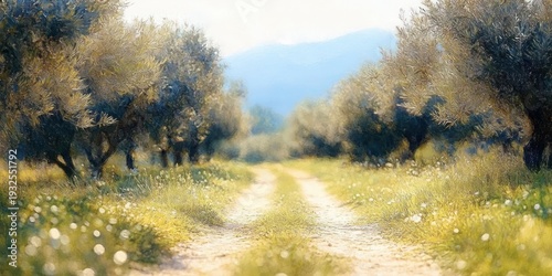 Tranquil sunlit country path through an olive grove with wildflowers, soft bokeh and distant blue mountains on a golden morning