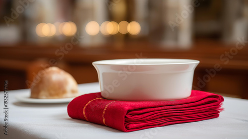 Ceremonial baptismal font ready for sacred rite, evoking sense of purity and faith, sacramental vessel display, religious initiation preparation, church baptistry fixture, defocused background,