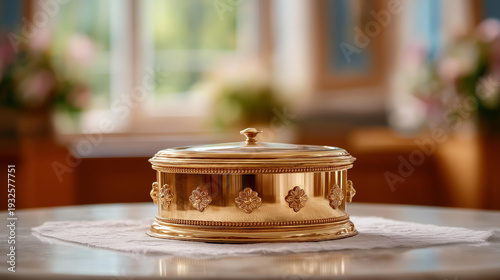 Ceremonial baptismal font ready for sacred rite, evoking sense of purity and faith, sacramental vessel display, religious initiation preparation, church baptistry fixture, defocused background,
