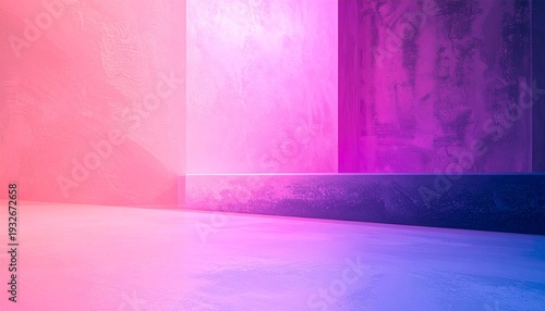 Abstrakcyjne minimalistyczne wnętrze z betonowymi ścianami oświetlone intensywnym neonowym światłem w kolorach różu i fioletu tworzące nowoczesne tło.