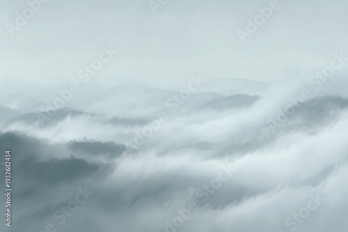 Widok na zamglone szczyty górskie pokryte warstwą białych chmur, minimalistyczna panorama przyrody w chłodnych odcieniach błękitu i szarości.