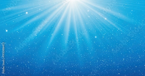 Jasne niebieskie tło z promieniami słońca padającymi z góry oraz błyszczącymi cząsteczkami kurzu tworzącymi magiczną i spokojną atmosferę.