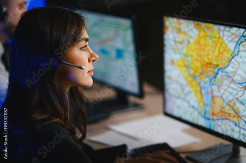 Female dispatcher monitoring map on computer screen