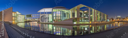 BERLIN, GERMANY, FEBRUARY - 16, 2017: Panorama of modern Government buildings over the Spree river in evening dusk.