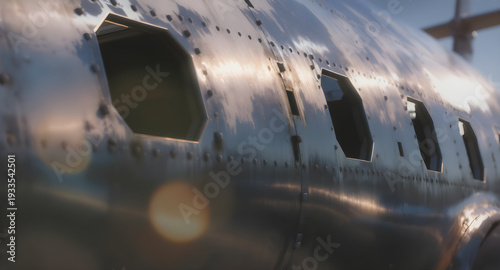 Vintage airplane fuselage with rivets and window openings