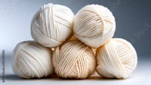 A beautifully arranged stack of soft wool yarn balls in cream tones, highlighting texture and warmth, ideally suited for knitting or crafting projects.