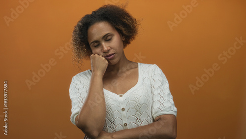 Woman resting chin on fist with closed eyes in studio with orange backdrop wearing knit white cardigan; fatigue introspection pensive.