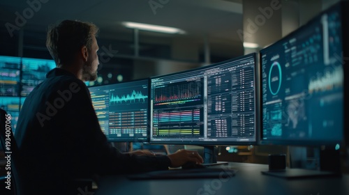 Professional analyzing data on multiple screens in technology office, optimizing digital performance with real-time analytics and insights.