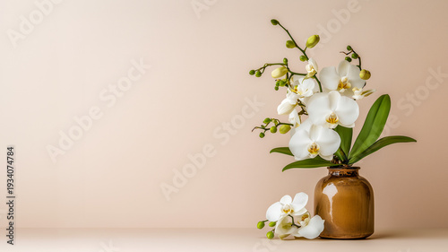 Bukiet białych orchidei w glinianym wazonie na jasnym tle minimalistyczne wnętrze
