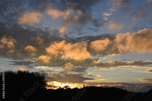 Nuvens na aurora. Céu dramático no crepúsculo. Silhueta de árvores no horizonte.