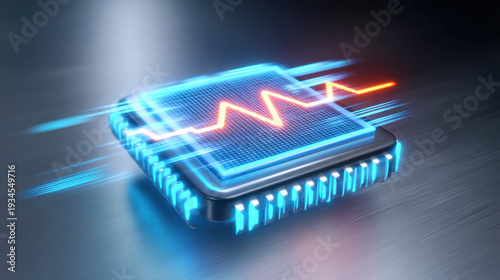 Glowing microchip with neon heartbeat waveform and motion blur conveying fast processing and energy in futuristic circuit