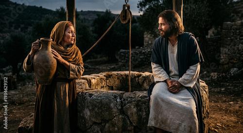 Biblijna scena rozmowy Jezusa z Samarytanką przy studni. Jezus i kobieta prowadzą ożywioną rozmowę.