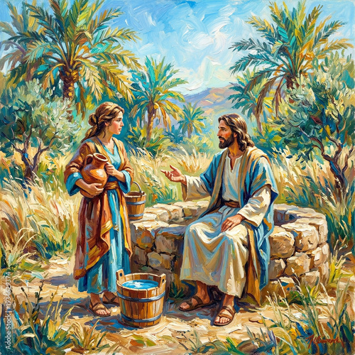 Biblijna scena rozmowy Jezusa z Samarytanką przy studni namalowana krótkimi, grubymi pociągnięciami pędzla.Postacie Jezusa i kobiety przenikają się z otaczającą naturą – palmami i suchą trawą