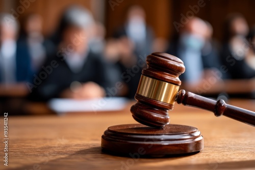 Tense Courtroom Scene with Judges, Gavel, and Blurred Background Action