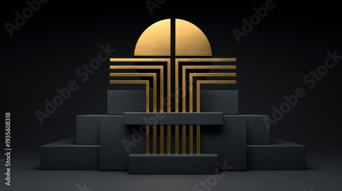 Luxurious geometric sculpture featuring golden elements atop dark tiered pedestals in a subdued setting