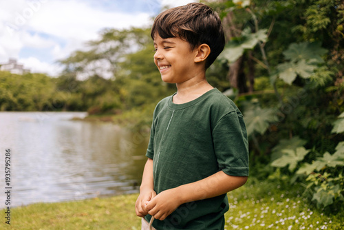 Brazilian boy smiling near a calm lake surrounded by greenery, portraying joyful childhood, outdoor freedom and connection with nature in a peaceful environment.