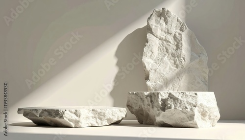Podi espositivi minimalisti in pietra bianca grezza con ombre drammatiche per presentazione prodotto
