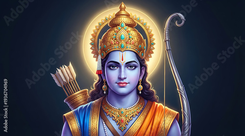 Lord rama portrait with golden crown and bow for ram navami and dussehra festivals representing victory of good over evil during traditional rama puja celebration