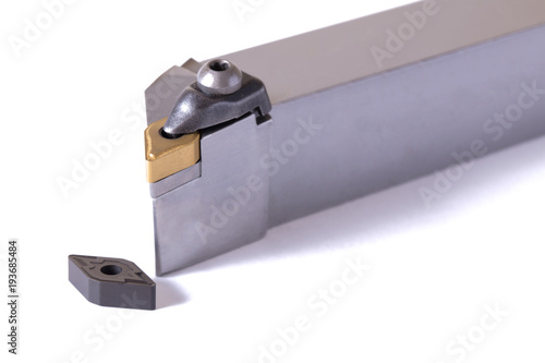 Токарный резец. Оснастка для токарного станка по металлу. Металлорежущее оборудование. Белый фон. Turning cutter. Equipment for the lathe on metal. Metal-cutting equipment. White background