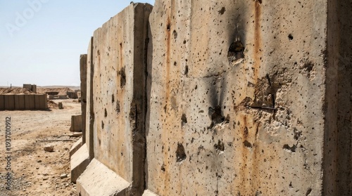 Weathered Concrete Blast Walls Showing Signs of Impact Damage and Rust