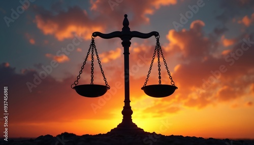 Scales of justice silhouette against dramatic sunset sky. Symbolizes balance fairness and legal equilibrium. Represents truth ethics and moral choices.