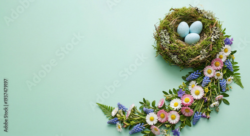Małe gniazdko z mchu w prawym górnym rogu, w którym leżą trzy niebieskie pisanki i długi tren z wiosennych kwiatów i liści na niebieskim tle