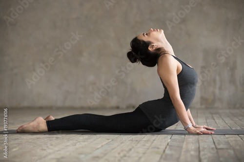 Young woman practicing yoga, doing Cobra exercise, Bhujangasana pose, working out, wearing sportswear, black pants and top, indoor full length, gray wall in yoga studio
