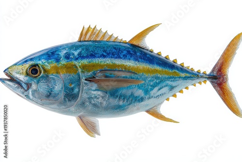 Bluefin tuna fish with vibrant blue and yellow coloration, showcasing detailed fins and scales, isolated on a white background for clear visibility and identification