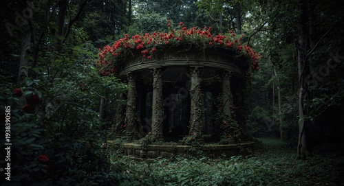 #413961371Mysterious ancient ruin hidden deep in the jungle overgrown with vines and moss-covered stones intricate carvings on weathered walls surrounded by lush vegetation