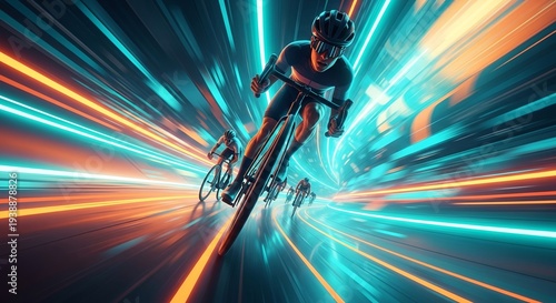 Lead cyclist in perspective view, dynamic light streaks and velocity blur, racing toward the front, futuristic virtual track, action sports illustration