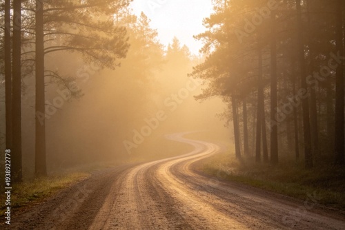 Winding dirt road in misty forest
