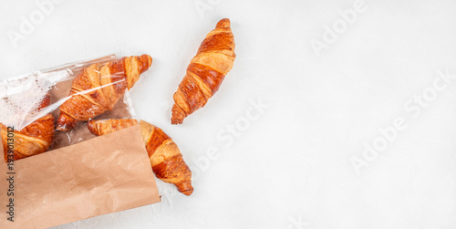 Fresh Croissants in Paper Bag on Light Background Top View