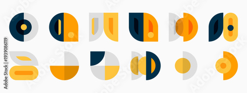 Geometric shapes, circles, rectangles, lines create abstract patterns. Colors include navy, gold, beige, gray. Minimalist design, modern aesthetic.