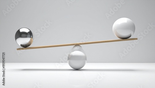 3D render of a wooden plank balancing on a white sphere. Three small white orbs on the left side counterweight a single large gold sphere on the right. Minimalist, soft shadows, studio lighting.