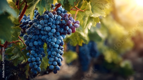 Close up of ripe purple wine grapes growing in vineyard during golden sunset light. Agriculture and wine production concept.
