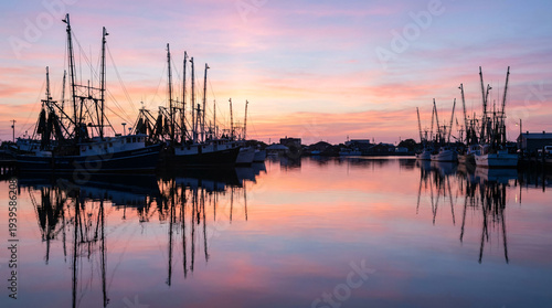 Zachód słońca nad spokojnym portem i odbiciem łodzi w wodzie